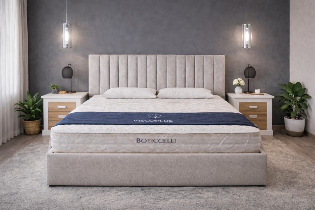 El cabecero tapizado de líneas verticales se convierte en el gran protagonista del espacio, aportando textura, estilo y una presencia distinguida que eleva la estética de cualquier dormitorio.